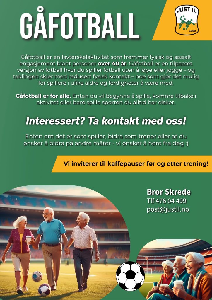 Fotballgruppa i Just IL ønsker å ha tilbud til alle. Per dags dato har vi tilbud fra G/J7 og opp til og med oldboys, men vi vil gjerne favne flere! Vi ønsker derfor å starte opp med gåfotball i Just IL!