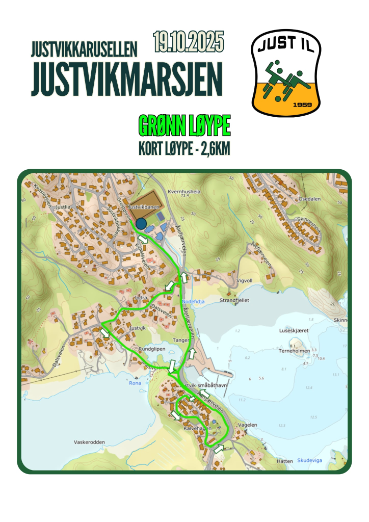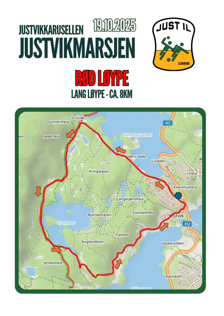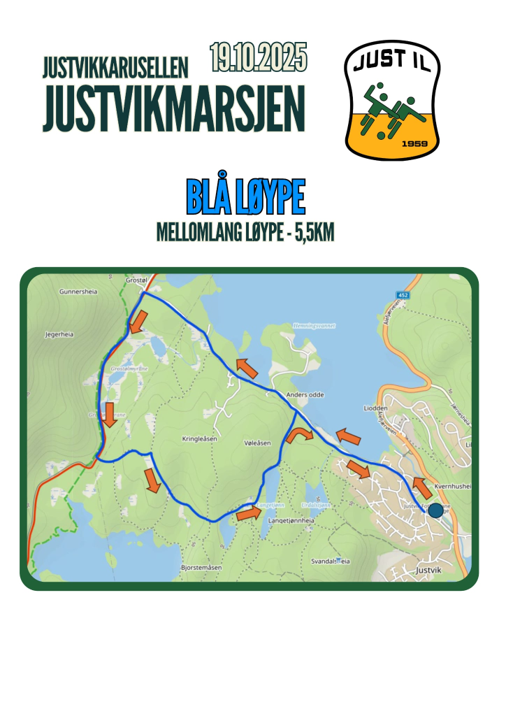 Vi gjentar suksessen fra sist høst og arrangerer Justvikmarsjen også i år. Årets marsj er lagt til søndag 19.10.2025. Det blir også i år tre løyper å velge mellom: En lang, en mellomlang og en kort løype. Minst en av løypene er tilgjengelig for rullestol/barnevogn.